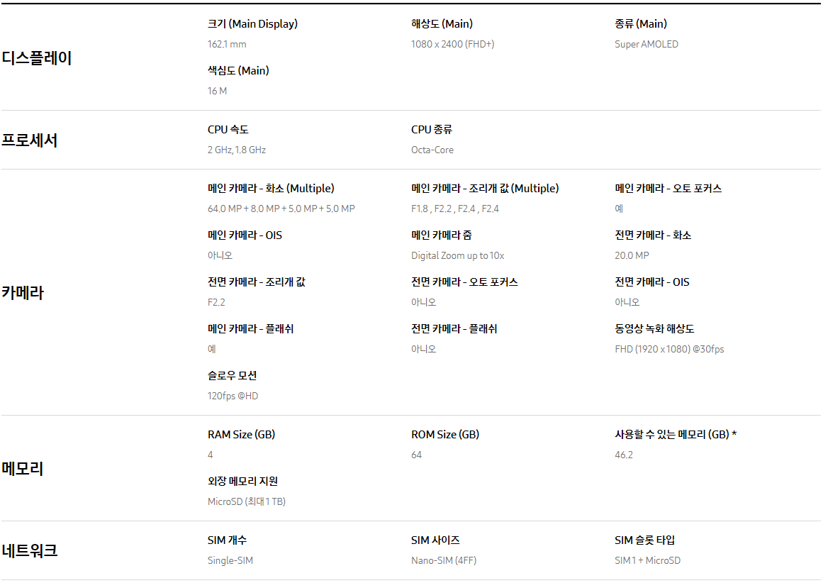 카메라는 전면 2000만, 후면 6400만+800만+500만+500만이다. 조카들이 전면카메라로 셀카를 많이 찍었는데 얼굴도 뽀샤시하게 잘 나오더라.
