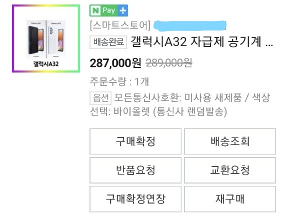 네이버 지식쇼핑에서 갤럭시 A32 공기계폰을 287,000원에 샀고, 삼성 공식홈페이지에서 자급제 폰은 374,000원에 판매하고 있다. 공기계는 찾아보면 몇만원 더 싼 곳도 있었는데, 리뷰가 많은 곳에서 사다보니 돈을 좀 더 줬다.