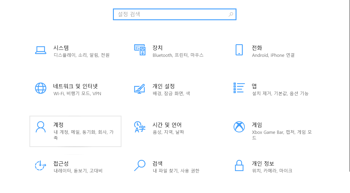 1. 윈도우 아이콘을 클릭 후 [설정]-[계정]을 클릭한다.