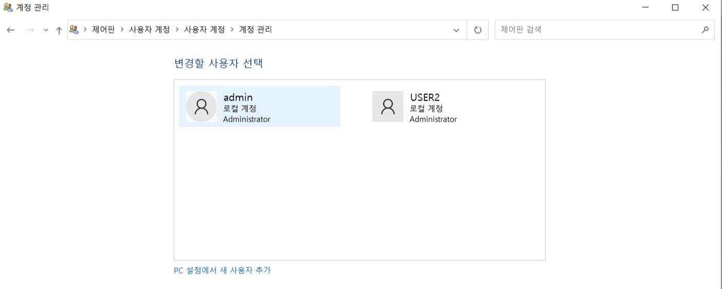 그럼 이렇게 원래 내가 쓰던 계정(admin)과 방금 내가 추가한 계정(USER2)이 뜬다. 각각 계정을 클릭한 후 [계정 유형 변경]을 클릭한다.