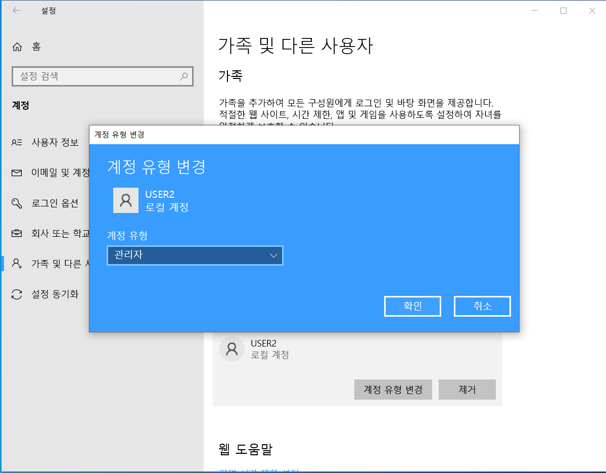 6. 두 계정의 계정 유형이 같은지 확인한다. 내가 쓰던 admin 계정이 표준이라면 새로 만든 USER2 계정도 표준으로 두고(이 때는 관리자로 바꿔도 상관없긴 함), admin계정이 관리자라면 USER2 계정도 관리자로 맞춰준다.