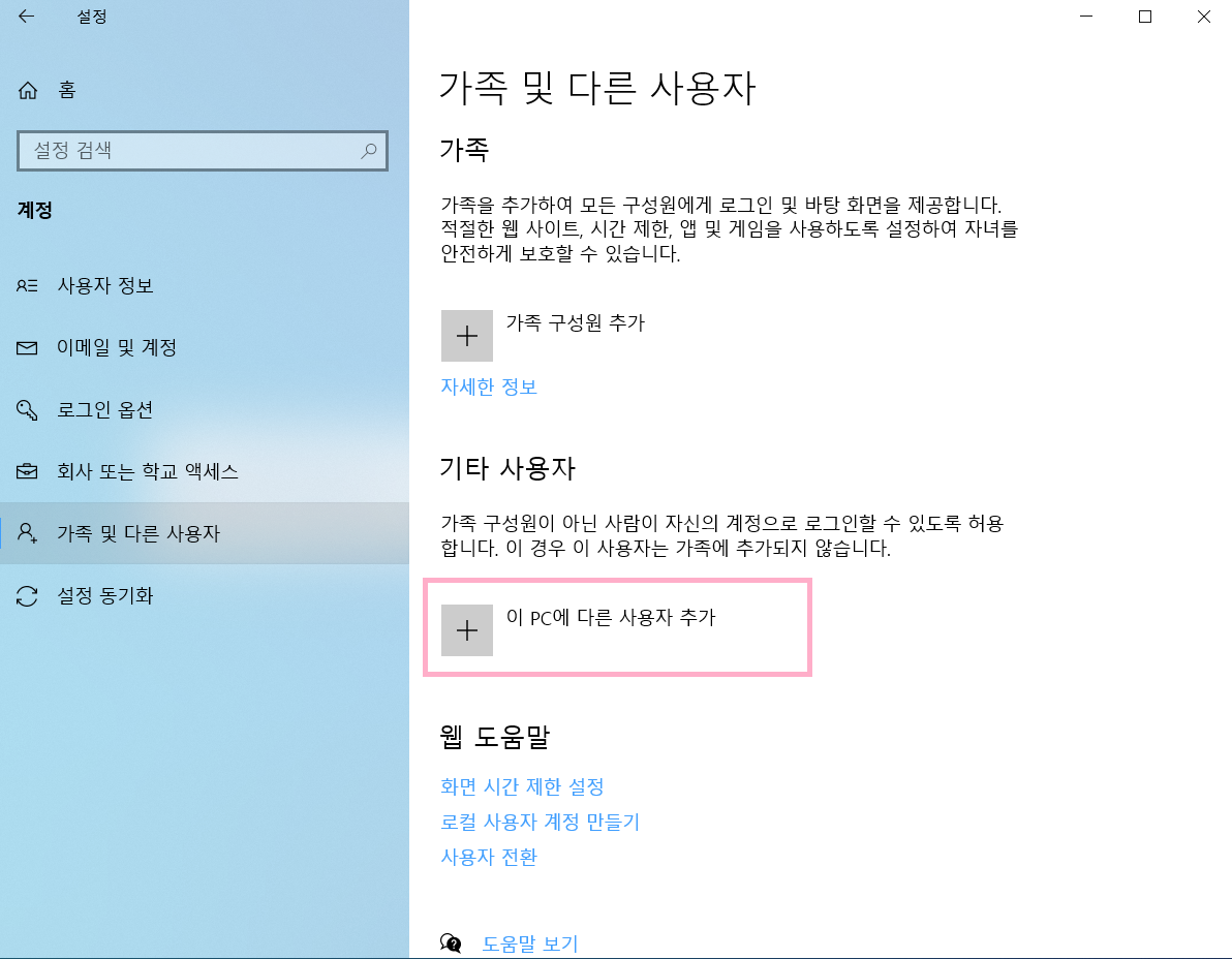 2. 그럼 이 화면이 뜨는데, 여기서 [가족 및 다른 사용자]-[이 PC에 다른 사용자 추가] 클릭하기