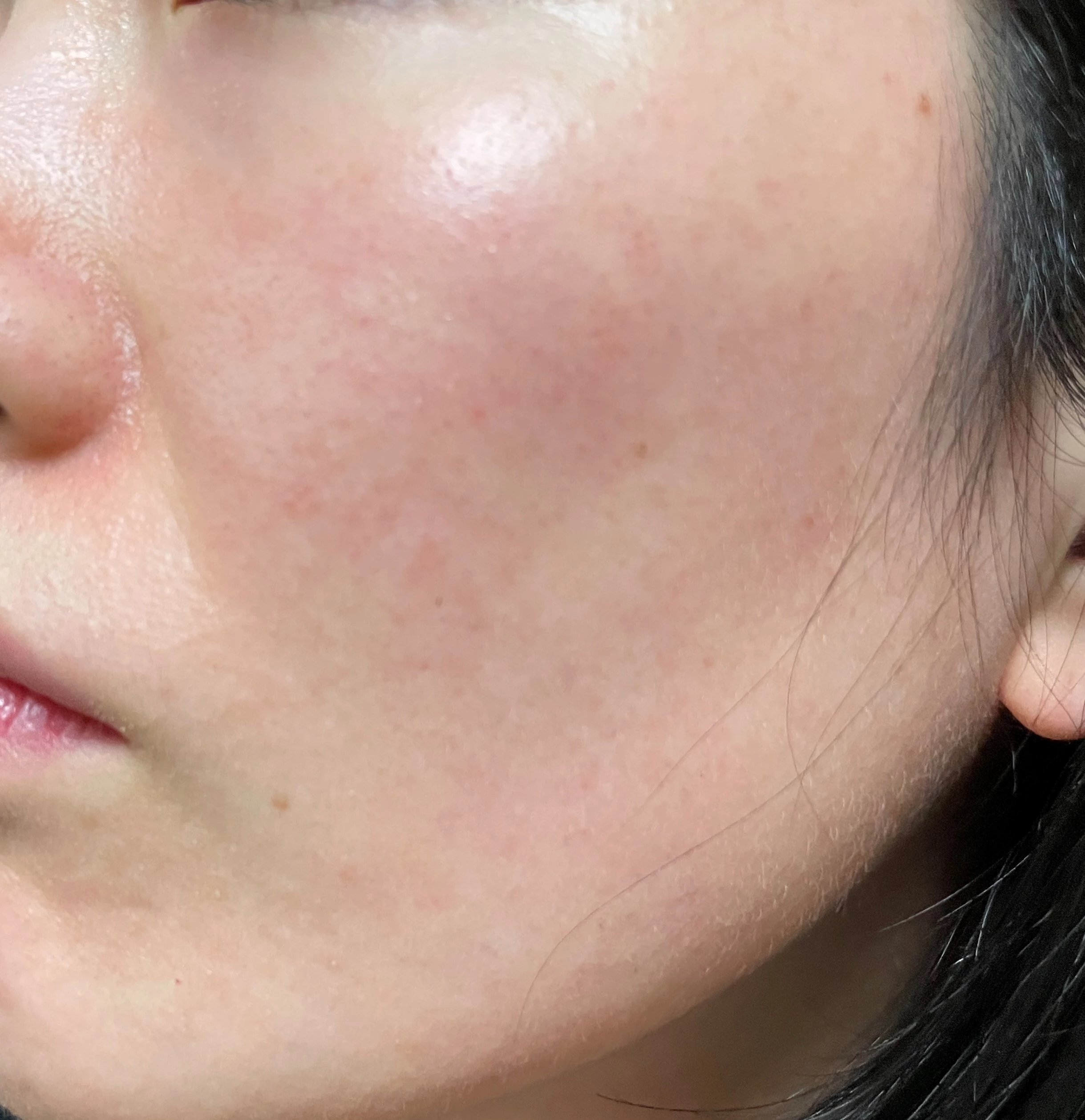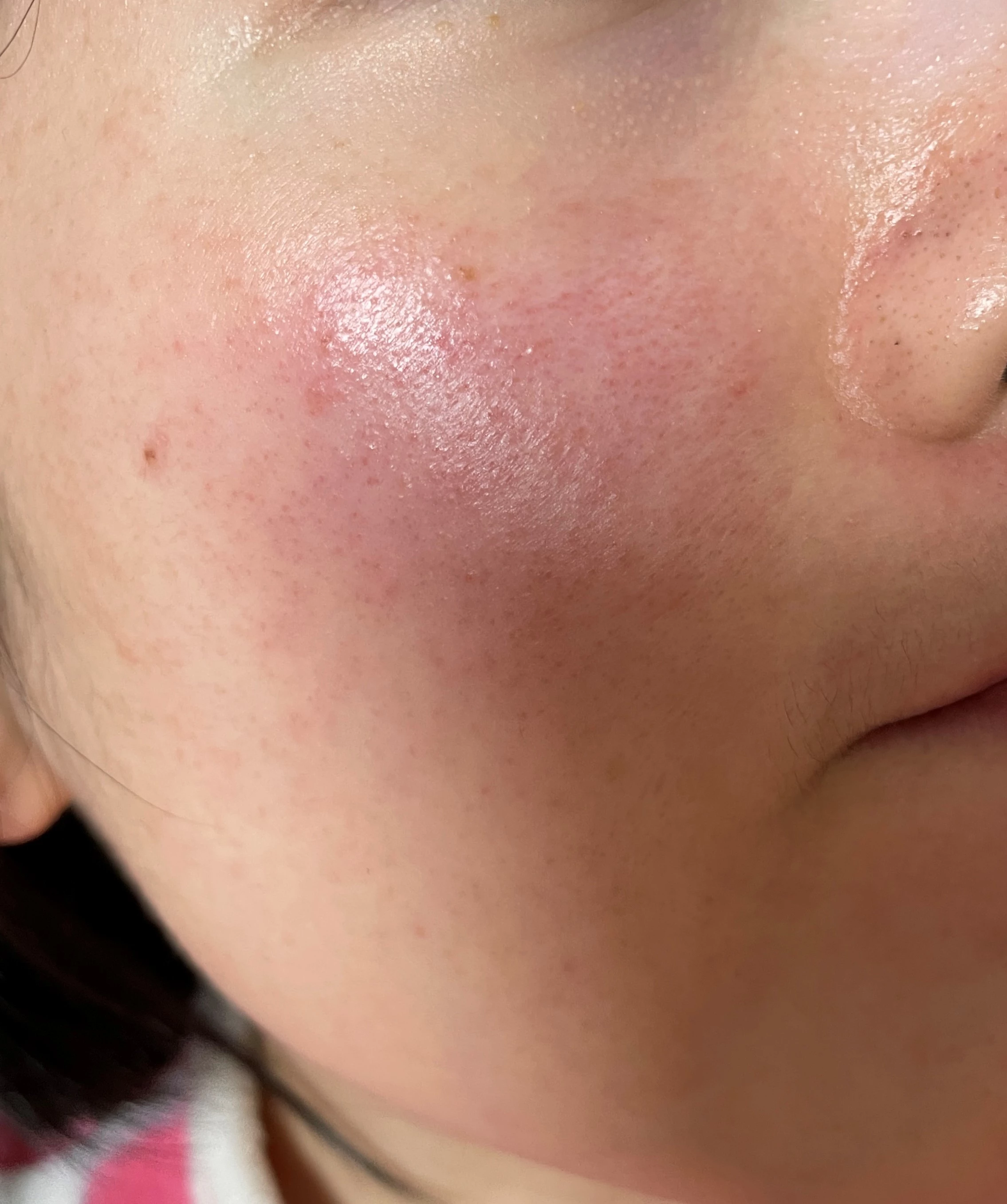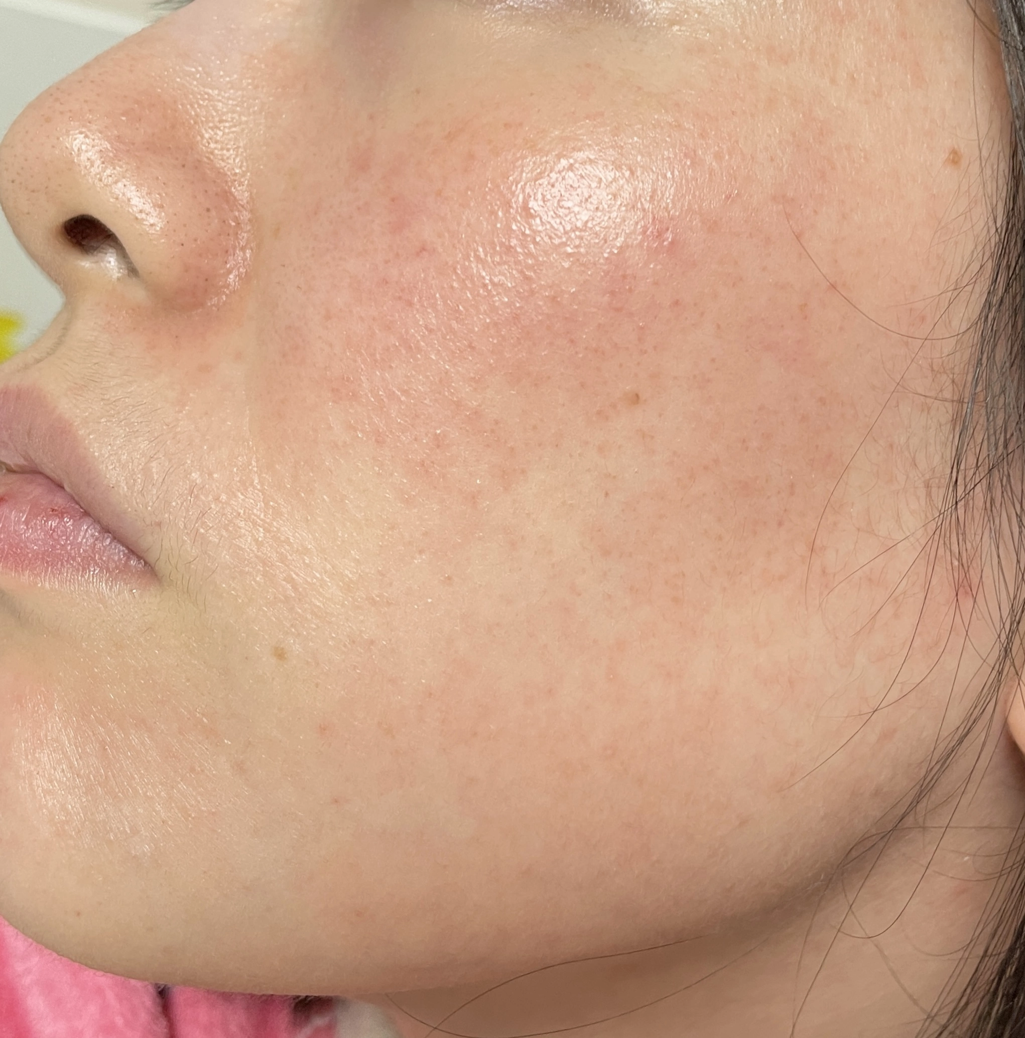 수란트라 바르기 전 사진이다. 이 사진을 찍고 병원에 가야겠다는 마음이 들었다. 잘라내기가 힘들어서 볼 말고 다른 부위 사진은 없지만 턱이나 이마가 더 심했다. 그리고 볼에 있는 저 빨간색 점점점.... 같은걸 꼭 없애고 싶었다.
